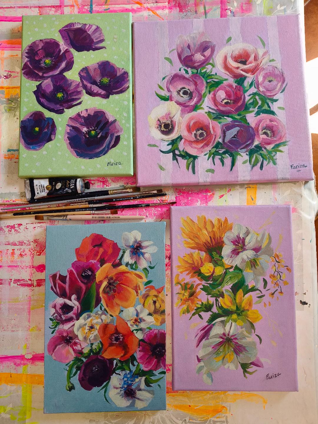 En estos días he estado trabajando en una nueva serie de pinturas en pequeño formato, enfocadas en composiciones florales llenas de color, textura y movimiento. Estas obras están realizadas en óleo sobre lienzo, una técnica que me permite explorar la riqueza del color y la profundidad del trazo con total libertad.